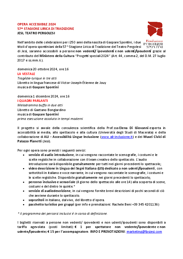 Nel triennio 2022-2024, il Comune di Jesi ha partecipato come ente capofila al progetto “Marche for all”, realizzato con il contributo della Presidenza del Consiglio dei Ministri – Ministro per le Disabilità e con il co-finanziamento della Regione Marche. Scopo del progetto era rendere accessibile l’opera lirica anche a spettatori con disabilità visiva e uditiva attraverso video introduttivi all’opera disponibili anche in Lingua Italiana dei Segni, sopratitolazione dal vivo del libretto e audiodescrizioni delle scene durante lo spettacolo e percorsi sensoriali alla scoperta dei costumi, delle scene e del dietro le quinte. A corredo del progetto sono stati sviluppati pacchetti turistici che hanno permesso ai melomani di scoprire anche il patrimonio artistico e architettonico di diverse città marchigiane, in un connubio ragionato tra arte e musica. Dopo la conclusione del progetto, la Fondazione Pergolesi-Spontini, che gestisce il teatro di tradizione della città di Jesi, ha deciso di continuare a rendere accessibili i principali titoli delle proprie stagioni liriche abbinandoli alla visita dei Musei Civici di Jesi. In allegato trovate la proposta per la stagione lirica 2024-2025.